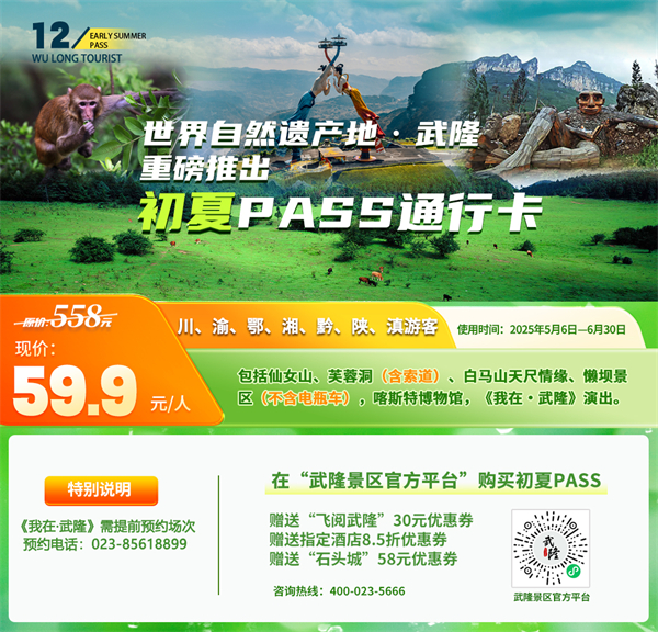@川渝鄂湘黔陜滇籍的朋友們,還在煩惱5、6月去哪找清涼?這不武隆景區(qū)新推出的初夏Pass為你解憂了,你跟著沖就對了!2025年5月6日—6月30日期間,川渝鄂湘黔陜滇籍游客,轉(zhuǎn)發(fā)武隆旅游Pass卡相關(guān)信息到朋友圈,只需59.9元,就能解鎖價(jià)值558元的仙女山、芙蓉洞(含索道)、白馬山天尺情緣、懶壩(不含電瓶車)景區(qū),《我在·武隆》演出,喀斯特博物館,簡直是性價(jià)比天花板!