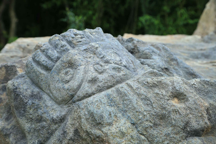 2015年,當(dāng)?shù)貙?duì)神農(nóng)部落旅游資源進(jìn)行調(diào)查時(shí),偶然發(fā)現(xiàn)了多處巖石上的凹穴。在桐柏山上竹林環(huán)繞的半山腰處,一塊巖石上赫然可見一處形似人面像的巖畫——“頭頂”約有10條線狀紋飾,組成“皇冠”的圖案;面部的圓環(huán)和圓點(diǎn),表示“雙眼”;下部5條射線狀紋飾,恰似“胡須”。這一長(zhǎng)20厘米、寬27厘米的人面像,是隨州發(fā)現(xiàn)的石器時(shí)期最為具象的巖畫,被當(dāng)?shù)厝朔Q為“太陽(yáng)神”,也有人稱他為“炎帝神農(nóng)像”。