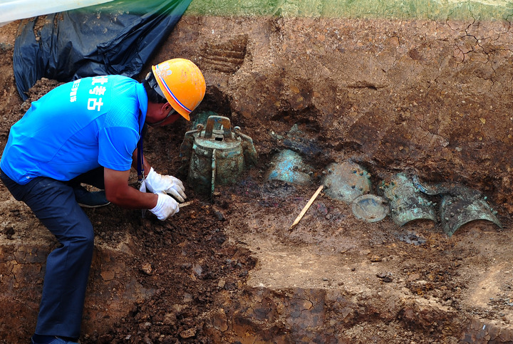 2013年7月4日,在M111墓葬內(nèi),工作人員在對(duì)編鐘進(jìn)行挖掘工作。新華社記者肖藝九攝