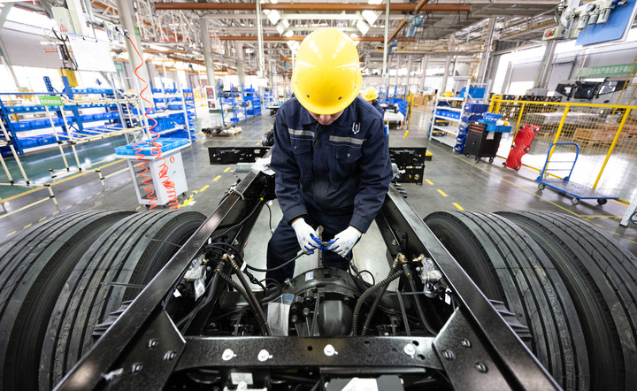 2月13日,工人在程力專用汽車股份有限公司新能源商用車底盤裝配線上作業(yè)。新華社記者肖藝九攝