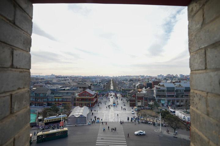 2024年12月26日,從正陽(yáng)門箭樓內(nèi)向南拍攝的北京前門大街和遠(yuǎn)處的永定門城樓。新華社記者 鞠煥宗 攝