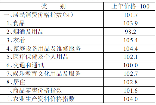 居民消費(fèi)價格總指數(shù)上漲1.7%,其中:食品價格上漲3.9%,居住價格上漲2.8%。