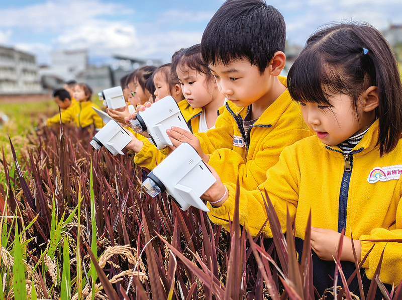 在金色的稻田里,孩子們興致勃勃地觀察飽滿的稻穗,用放大鏡探索稻粒的奧秘,親手收集稻種,沉浸式感受“汗滴禾下土”的辛勞。農(nóng)技人員現(xiàn)場(chǎng)生動(dòng)講解旱稻種植知識(shí),帶領(lǐng)孩子們認(rèn)識(shí)稻谷的生長(zhǎng)過(guò)程,讓他們?cè)趯?shí)踐中領(lǐng)悟農(nóng)耕文化的深厚內(nèi)涵。