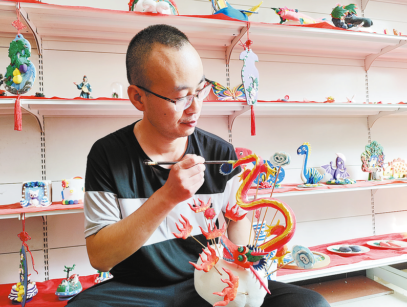 張廣新坐在工作臺前,用手捏制一只大臉貓。不一會兒,一個造型夸張、憨態(tài)可掬的大臉貓便呈現(xiàn)出來,看上去賞心悅目。